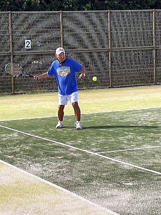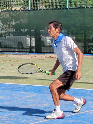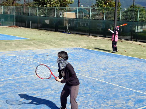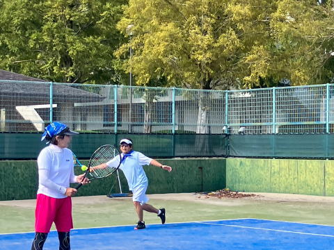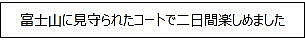 | 2日目は、皆さん朝風呂、そしてしっかり朝食で準備万端。この日も地元小笠原さんご夫妻のご配慮で 3コート確保できた御殿場中央コートに場所を変えて各自6試合、白熱のプレーを展開。 |