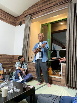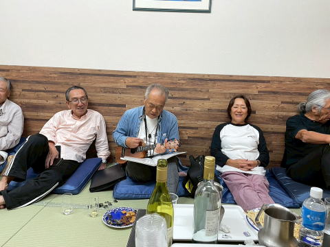 | 初日の締めくくりは恒例の嬉野さん撮影によるテニスプレー・ビデオ反省会。現実の姿を垣間見た 自己反省と思わず漏れるため息、やはりビデオチェックはいつも効果的だったようです。 ※ビデオ反省会の写真は、これまた世話人の怠慢により取り忘れ・・・申し訳ありませんm(__)m その後、初参加の三名の方(山口・大島g・田淵g)より自己紹介がありましたが、それぞれになか なか含蓄のあるお話ばかりで、ヤマハ人生とリタイア人生を語って頂きました。 |